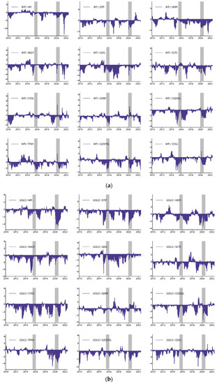 (a) Net dynamic pairwise volatility directional spillover between WTI and electricity companies’ stock prices; (b) Net dynamic pairwise volatility directional spillover between gold and electricity companies’ stock prices.