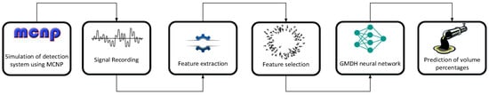 Many researchers have shifted in recent years to using an X-ray source instead of gamma in their structures to avoid issues such as requiring personnel to wear protective clothing when working with this device (due to its inability to be turned off). X-ray tubes were used to distinguish multiphase flow characteristics [,]. In [], for instance, the aforementioned complementary source was used. With the use of an X-ray tube and a sodium iodide detector, the researchers were able to determine the regime type and volume fraction of two-phase flows. Temporal features extracted from the signals received by the detector were also used to train two MLP neural networks in their proposed structure. The study [] looked at three-phase flows and simulated them in three different regimes (annular, stratified, and homogeneous) at varying volumes. Three RBF neural networks were developed in this study and trained using the frequency characteristics of the received signals, yielding satisfactory results. X-ray tubes were used to model a control system in []. The MCNP code was used to model the interactions between four petroleum products when they were combined in pairs at different volumes. Three MLP neural networks were fed the recorded signals to make predictions about the volume distribution ratio of the three products. Researchers claimed that knowing the volume ratios of the first three products would allow them to compute the volume ratio of the fourth product. While the introduced method could make predictions regarding the product types and amounts, the lack of feature extraction techniques limited the accuracy of those predictions. In order to build upon earlier studies [], wavelet transform was used for feature extraction by Balubaid et al. in [], which effectively decreased computational load and improved accuracy. The key flaw in the majority of the aforementioned studies is the absence of feature extraction and feature selection methods that could be employed to artificial neural networks. This study makes an effort to propose a technique for extracting time-domain, wavelet, and frequency-domain features and choosing the most useful characteristic using the PSO algorithm. Figure 1 illustrates the recommended technique. The main contributions of current study are summarized here.
