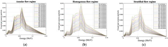In this study, we use the MCNP algorithm to simulate the detection system, which consists of an X-ray tube and a NaI detector on opposite ends of a Pyrex-glass pipe. Instruments that use ionizing radiation as a measuring standard have been modeled using this code [,,,,]. The basic geometry of the planned setup is shown in Figure 2. When analyzing two-phase flow, photons from an X-ray tube are sent to a pipe and, after being somewhat attenuated by the pipe walls and contents, are picked up by a detector. The amount of gas and liquid within the pipe accounts for the attenuation of the radiation beam. This study simulates three different flow patterns (shown in Figure 3) and nineteen various volume fractions, ranging from a 5% void fraction to a 95% volume fraction with a 5% void fraction step (57 simulations were used in total). It is worth noting that prior research has corroborated the results of this investigation’s simulations []. In this study, several laboratory structures were constructed and compared with the data acquired from the MCNP code. To facilitate a direct comparison between actual and simulated findings, the Tally output from the MCNP algorithm was converted to units per source particle. The difference between the results of the simulation and the experimental setup represented the biggest relative error, at 2.2%.