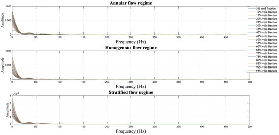 To extract frequency features, the FTT (Equation (1) []) was employed to transform the received signal into the frequency domain. The transmitted signals in the frequency domain for three regimes, annular, homogeneous, and stratified, are shown in Figure 6. AFDF, ASDF, and ATDF were extracted from frequency-domain signals.