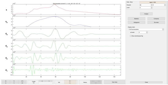 Discrete wavelet coefficients at the jth level are specified here. Thus, for a given mother wavelet ψ(t), a perfect match between the detail coefficients of the filter bank and a wavelet coefficient of a discrete collection of child wavelets is guaranteed by selecting h[n] and g[n] appropriately. Average a4 and average d1–d4 characteristics were derived from the investigated signals and employed in the following procedures.