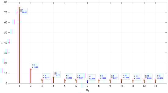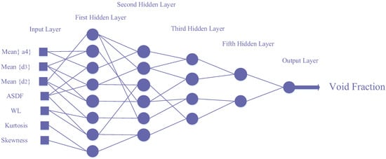 As explained in the previous sections, 13 characteristics were extracted from the recorded signals in terms of time, frequency, and wavelet transform. The PSO method was used to determine the suitable mode. First, a characteristic was applied to the PSO system, and the cost function was calculated. Then, the number of characteristics increased to 13, and the PSO algorithm found the suitable mode for each of the characteristics and calculated the cost function. Figure 8 shows the value of the cost function according to the number of input characteristics. Carefully, in this figure, it can be seen that the value of the cost function in the selection of seven characteristics has the lowest value. Therefore, seven characteristics have been chosen as the suitable mode. The lowest specified cost function is obtained for selecting the following characteristics: Mean{a4}, Mean{d3}, Mean{d2}, ASDF, WL, kurtosis, and skewness. These characteristics were introduced as the input of the GMDH neural network to predict the void fraction inside the pipe. This study trained many neural networks to estimate percentages of volume. In order to determine the void percentage, a GMDH neural network was trained. The GMDH network’s self-organization capacity is used to automatically create the trained network with a topology consisting of an input layer with seven neurons, an output layer, and four hidden layers, which have eight neurons, six neurons, four neurons, and two neurons, respectively. The structure of this network can be seen in Figure 9.