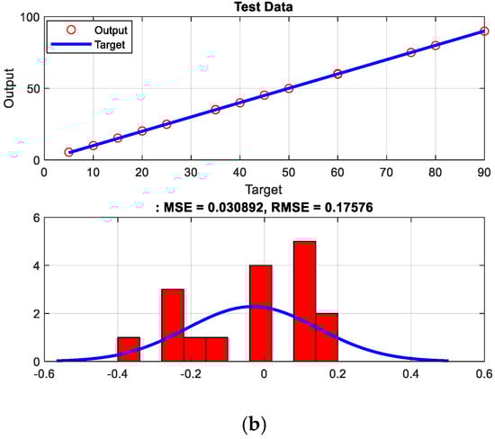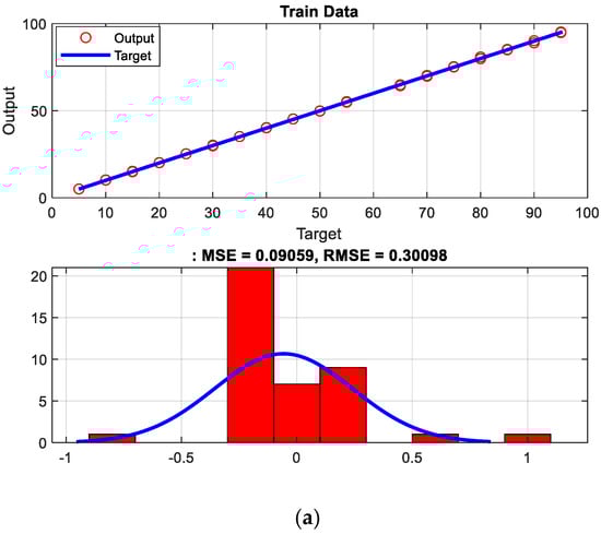 A pair of regression and error histogram diagrams depicting the network’s performance throughout training and testing datasets are shown in Figure 10. The red circles in the regression diagram represent the network’s output values, while the blue line represents the expected output. Matching both of them with each other indicates high accuracy in neural network prediction. The distribution of the error value is graphically represented in the error histogram diagram. The MSE and RMSE were computed for both the training and testing data. The maximum MSE and RMSE values are, respectively, 0.09 and 0.30. The diagnosis system presented in this study was compared with previous studies in Table 1.