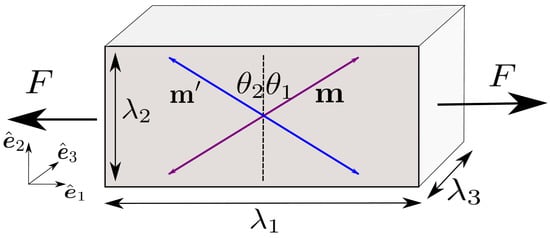 One way to quantify the anisotropy of the material is through the uniaxial tensile test (see Figure 1). The main stretch and the force exerted on the specimen F are measured; however, the transversal stretches , or are not. If one of these stretches is quantified, then the balance between the isotropy and anisotropy of the strain energy function could be determined. We will explain next how to quantify the anisotropy with the transverse stretches. First, the fibers will be oriented according: