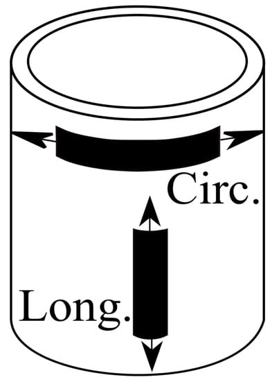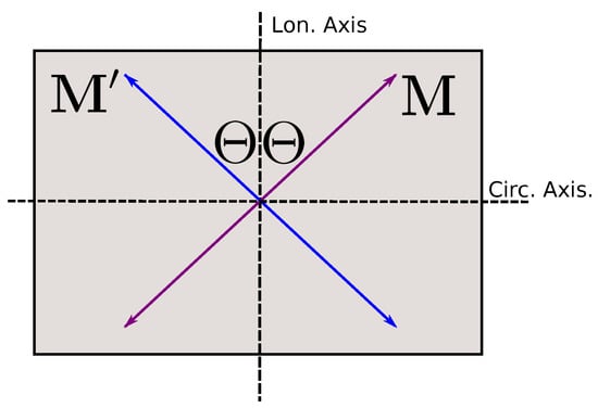 Arteries are modeled recurrently as an anisotropic hyperelastic material, and they are used in this work to exemplify the characterization methodology. However, all the described procedures can be extended to characterize any anisotropic hyperelastic material with one or two preferential directions. For example, arteries generally possess two families of collagen fibers that extend in a helical shape, so locally the arterial wall has a plane of anisotropy normal to the radial direction, which is conformed by the fibers. Families of collagen fibers share mechanical properties, and they are symmetrical with the longitudinal axis, which forms an angle , in the material configuration. The symmetry is shown in Figure 2.