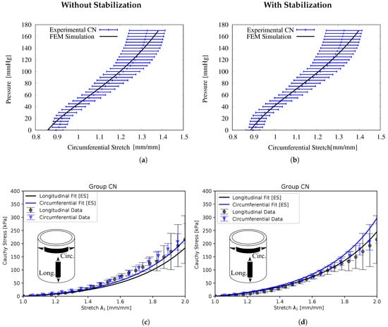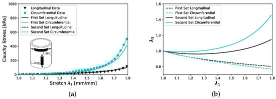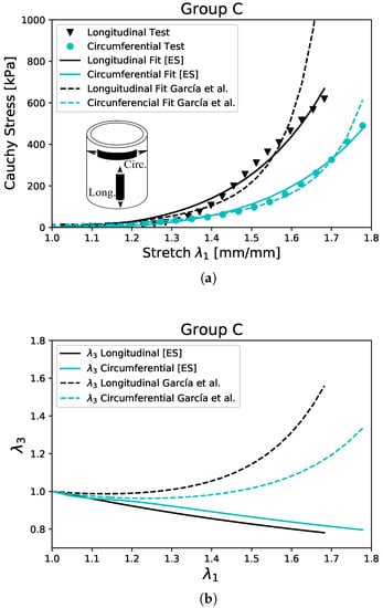 The experimental fit of the uniaxial traction and the traversal stretches are presented in Figure 11. It is clear that the set of parameters obtained adjusts better the data and satisfy the stability condition. In contrast, the results presented by Garcia are inherently unstable for large stretches since it was shown that the Holzapfel–Gasser–Ogden model will always be unstable for elongations tending to infinity.