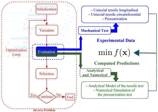There is significant research interest in adequately characterizing these materials to increase the accuracy of computational models. The characterization problem can be seen as an optimization one, which determines the constitutive model’s parameters that minimize the discrepancy concerning the experimental data. A wide range of experimental techniques are available to characterize hyperelastic materials, such as uniaxial tests in different directions [17], biaxial [18], bulge [19], pressurization [20,21], and AFM nanoindentation [22]. In each of these cases, the stress is modeled as a function of the material parameters. There are different alternatives for this, such as describing the deformation gradient as homogeneous [23], identifying the displacement field by optical means [24], or numerical simulations of the mechanical tests [25]. Describing the deformation gradient as homogeneous allows for analytical equations, but it is insufficient to describe the tests adequately in many cases. With optical methods, the strain gradient can be obtained with experimental measurements, but the experimental setup becomes complex and requires preprocessing and postprocessing the obtained displacement fields. The numerical simulations describe the mathematical model in detail but require extensive computational resources and therefore time-consuming. Regardless of the method used to model the mechanical tests, it is necessary to define an objective function to quantify the discrepancy between the mathematical model and the experimental values. The material parameters that minimize the objective function will be those that characterize the mechanical behavior of the material. In addition, it is necessary that these parameters correctly model different modes of deformation (e.g., uniaxial, equiaxial, pressurization), capture anisotropy if it exists, and meet certain (specific) stability criteria (e.g., Drucker [26] in isotropic materials).