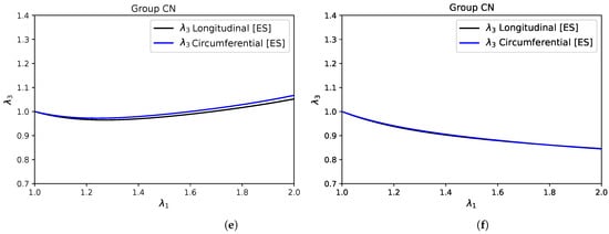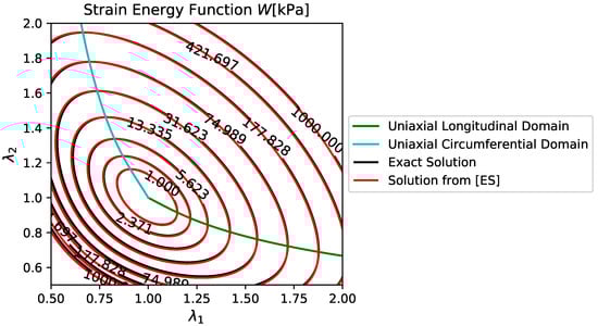 This equation can be obtained through the constitutive Model (23), and it can be seen that it is satisfied in Figure 10. In other words, it is verified that the gradient is zero at the intersection of the energy isocontours. In the circumferential curve, it is also satisfied that the gradient , the only difference is that the principal stretch is and the second principal stretch is .