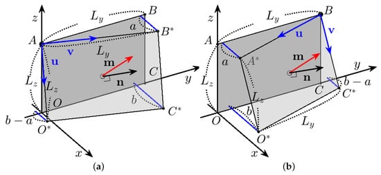Similarly, we consider the case in which B is fixed as shown in Figure 2b. Following the above method, we can obtain the specific coordinates of and , which are moved points from and C, respectively. To sum up, let us assume that the coordinates and C are given as follows: