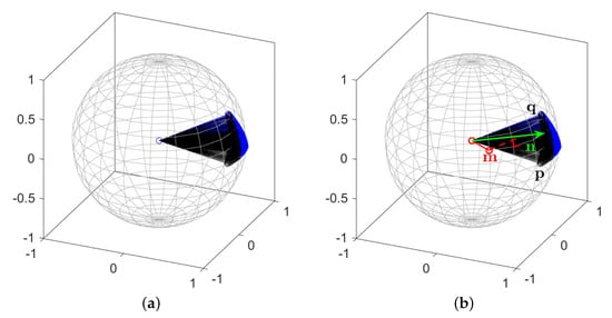 Subsequently, we need to evaluate the normal vector of the panel. In multi-apartment buildings, if an inclination angle is formed between the panel and the bottom plane perpendicular to the wall where the panel is installed less than a certain degree, it can be a nuisance downstairs due to a shade from the panel. For this reason, the angle is restricted by regulation, and we take a threshold as in this paper. Therefore, we can set the maximum value of b to ; hence we have the constraint for the problem (1). Figure 3a shows the curved triangular region where all the possible normal vectors can be located. Note that we set for simplicity.