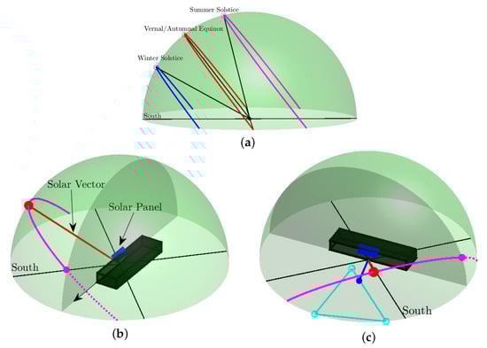 Therefore, combining all of the above conditions, we can find the best-fitted vector out of all the normal vectors that the solar panel can take along with respect to the solar vector. Figure 4c shows the evaluated solar vector and the derived best-fitted normal vector corresponding to the solar vector.