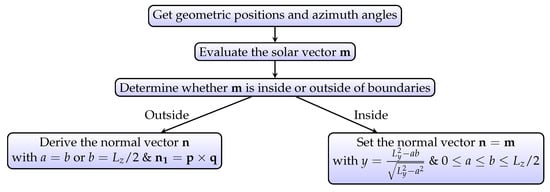 where . An important thing is that we can simplify the representation of boundary vectors as the relation between a and b. Three endpoints of the triangular boundary are expressed by (i) , , (ii) , where A is fixed, (iii) , where B is fixed. Thus, one can easily get the best-fitted orientation for the solar panel by following the above process.