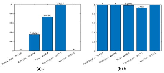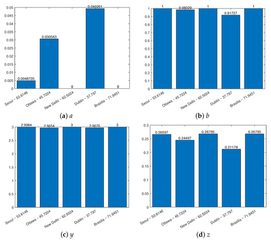 where is degree of the rotation axis of Earth, and d represents the number of days since January 1st in 2022. For instance, one can take for 09:00 A.M. on 4 January 2022. Note that this approximation formula is fitted to UTC + 00:00. Though there is a slight difference (up to the second decimal place) between the fixed and local time-based formula, this condition can be ignored because we consider the declination angle only up to the first decimal place. All the latitudes are sourced from [25]. Table 1 shows monthly installation specification data with respect to the monthly arithmetic average of the south altitude of each city with the azimuth angle from the north. Note that we use the notation to represent the computed parameters hereafter.