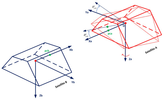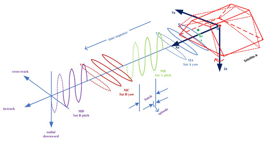 where is the angle during each sub-maneuver, the subscript denotes the sub-maneuvers of yaw or pitch angles, and denotes the satellite A or B that perform the sub-maneuver. The four sub-maneuvers are defined as Sub-Maneuver A (MA) , MB , MC , MD . is the initial biased attitude angle before each sub-maneuver, the reason for this is that the MWR ranging measurement is highly correlated to the attitude rotation with biased angle. The schematic illustration of this sub-maneuver is shown in Figure 1, taking MA as an example.