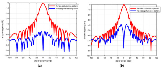 K/Ka antenna main polarization and cross polarization pattern. (a) K antenna. (b) Ka antenna.