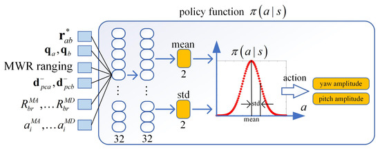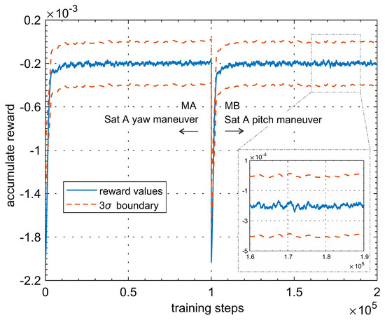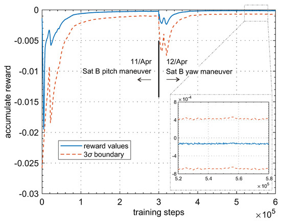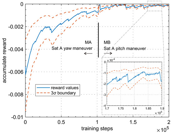 Reinforcement learning, a major branch of machine learning, has attracted scholars’ attention over the last decade. RL functioned adaptively to formulate a ’policy update’ through interactions with an environment [14]. Of the copious literature related to RL studies, policy gradient methods are a group of practical algorithms that are commonly used and well established [15,16]. The core idea of the RL process is to seek to maximize the performance index with respect to the parameters from the policy function by using gradient descent. Readers can refer to the aforementioned policy gradient method [16], off-policy actor-critic method and trust region optimization [17,18]. Application of RL to an aerospace system is rarely found in recent years, and some newly relevant literature may be found in [19,20,21].
