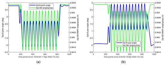 At the same time, the MWR ranging noises include oscillator noise, system noise and multipath noise, and ref. [13] concluded that the oscillator and system noise have small drifts in a short time interval, which can be easily removed by an algorithm as range bias. Moreover, multipath error is modeled as phase changed bias due to the angular motions of the satellite, which can be approximately cancelled by using mirror maneuvers.
