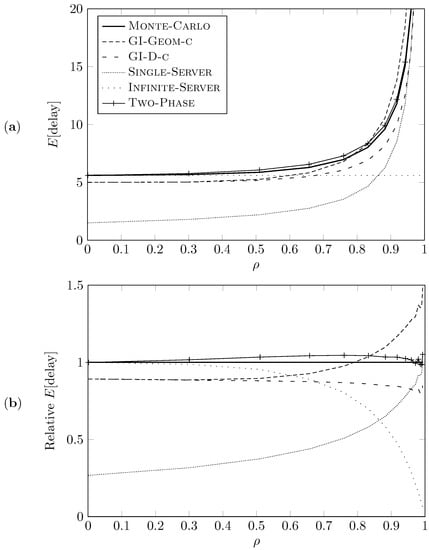 Unsurprisingly, as the load increases to 1, the mean customer delay approaches ∞. As can be seen in Figure 1a, all of our approximations model this behavior correctly except for the Infinite-Server approximation, which does not take the arrival rate into account at all. For high loads, however, it is difficult to see in Figure 1a which approximations are most accurate. Therefore, in Figure 1b, we show each of our estimates relative to the estimate from the Monte-Carlo simulations, i.e., Figure 1b shows the ratio between each of our mean delay approximations and the Monte-Carlo estimate. In this figure, it can be seen that the Infinite-Server approximation is very accurate if the load is less than 0.4, but falls off dramatically afterwards, as expected. Conversely, the Single-Server approximation is very inaccurate for loads less than 0.9, but becomes more and more accurate as the load approaches 1. This agrees with the discussion in Section 3.5. It can also be seen that the GI-D-c approximation consistently underestimates the mean delay, which is in accordance with observations in [8,10] that a lower variance of the service-demand or service-capacity distributions typically results in lower mean system content as well as mean delay in single-server systems. The same thus also appears to be true for this multi-server model. The GI-Geom-c approximation interestingly underestimates the mean customer delay for low loads while it overestimates the mean delay for high loads. This can be explained by the fact that this approximation estimates the mean service time for all loads as simply , in this case five slots, whereas the real mean service time for low load is slightly higher, namely approximately 5.6 slots, as can be seen, e.g., from the simulation results in Figure 1a, as the load goes to 0. For high loads, this model overestimates the mean customer delay because it assumes that the service times are geometrically distributed, whereas the relatively low variance (in comparison to the geometric distribution) of both the service-demand and the service-capacity distributions causes the real service times to have relatively low variance as well. This is true for all values of the load . Finally, the Two-Phase approach accurately approximates the mean customer delay for both high and low loads , as intended. Even for intermediate values of the load , the Two-Phase estimate of the mean customer delay never deviates from the value obtained by the Monte-Carlo simulations by more than 5% (i.e., the ratio between the Two-Phase estimate and the Monte-Carlo estimate in Figure 1b is always between 0.95 and 1.05).