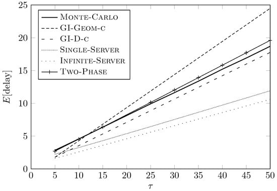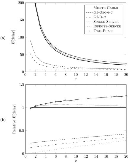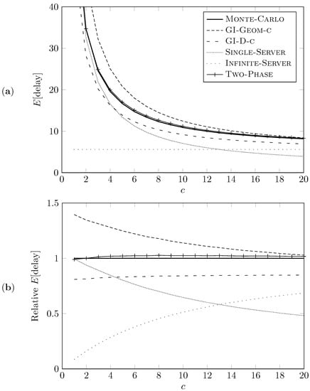 However, this last observation is mostly a coincidence, as we will demonstrate in our third numerical example, shown in Figure 3. In this example, all the parameters are the same as in our second example, with the only difference being that the service demands follow a “bursty” distribution, where each customer has a 95% chance of having a geometrically distributed service demand with mean 30 work units and a 5% chance of having a (shifted) geometrically distributed service demand with mean 430 work units. The mean service demand is still work units. Due to the fact that there is much more variance in the service demands, the mean customer delay is much higher in this case. As neither the GI-Geom-c nor the GI-D-c approximation take the variance of the service-demand distribution into account, these approximations significantly underestimate the mean customer delay. The Two-Phase approximation is also less accurate than in the previous example, deviating up to 25% from the Monte-Carlo estimate. This is because the assumption that (8) is true in the Two-Phase approach overestimates the waiting time by an amount that depends on the variance of the service-demand distribution. Indeed, as explained in Section 3.5, this assumption that (8) is true is exact if the service demands of the customers other than C are all deterministically equal to one work unit. Using a similar reasoning, it can be seen that the higher the variance of the service demands becomes, the less realistic this assumption becomes. For instance, if both the variance of the service demands as well as the amount of unfinished work in front of customer C are large, then it is not unlikely that most of these work units are nevertheless only part of the service demand of a single customer, and are therefore only occupying a single server, leaving the other servers free to serve other customers, potentially including the arbitrary customer C. Therefore, we conclude that the Two-Phase approximation becomes less accurate if the variance of the service demands is high. In Figure 3, it can even be seen that the Single-Server approximation is more accurate than the Two-Phase approximation in this case, although this is aided by the fact that the load is relatively high.