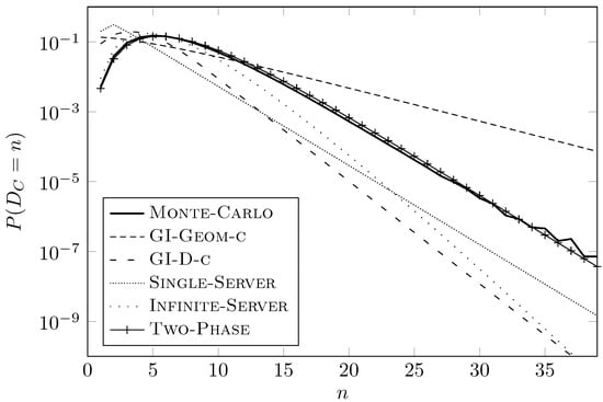 The mean customer delay is not the only performance characteristic that one might be interested in. Furthermore, the variance, other moments, tail probabilities, or the entire probability mass function of the customer delay may be of interest. In Figure 5, we show the probability mass function of the customer delay for the various approximations discussed in Section 3. The arrival, service-demand, and service-capacity distributions and the number of servers are the same as in Figure 1, with the arrival rate chosen such that the load . In Figure 5, it can be seen that the Two-Phase approach provides a good approximation for the probability distribution of the customer delay. In fact, it appears that the rate of exponential decay of the probability mass function is the same for the Single-Server approximation and the Two-Phase approximation as for the real multi-server queuing system. This is not only the case for this particular example, but it is true for all other examples that we have explored. This can be explained as follows. As mentioned in Section 3.5, when all servers are busy in a certain slot k, i.e., the total available service capacity is utilized during slot k, and the total number of unfinished work units in front of a customer in the queue decreases by the total combined service capacity of all servers. This is the same for both the Single-Server approximation and the Two-Phase approach (in the term corresponding to the queuing phase) as for the real system. Furthermore, as the delay of a customer C increases, the probability that all servers are occupied during all the slots where this customer C is in the system approaches 1. If there are many customers in front of customer C when this customer C arrived, then it will take a similar amount of time for customer C to reach the front of the queue regardless of whether there is only one server or multiple (provided, of course, that the combined service capacity is the same). Therefore, the ratio of should be similar for large n for the Single-Server estimate, the Two-Phase approach, and the real multi-server queuing system.