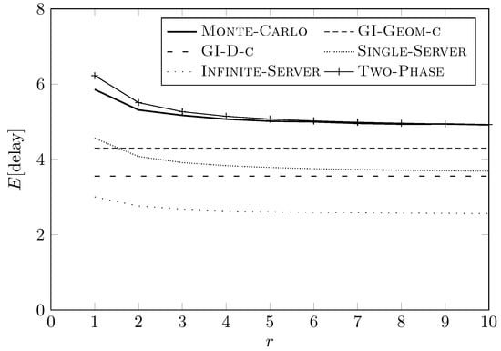 In our last numerical example, shown in Figure 6, we study the impact of the variance of the service-capacity distribution on the mean customer delay. In this example, there are servers, and the service capacities follow a negative-binomial distribution with a mean value of work units and r phases, for various r. As r increases, the variance of the service-capacity distribution decreases. The service demands follow a (shifted) negative-binomial distribution with five phases and a mean of work units, and the arrivals follow a Poisson distribution with a mean arrival rate chosen such that the load . Note that the GI-Geom-c and GI-D-c estimates do not depend on r, as expected. In Figure 6, it can be seen that the variance of the service-capacity distribution plays a relatively small role in determining the mean customer delay. Indeed, the more servers there are, the smaller the impact of the variance of the service capacity of a single server becomes.