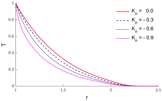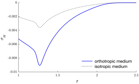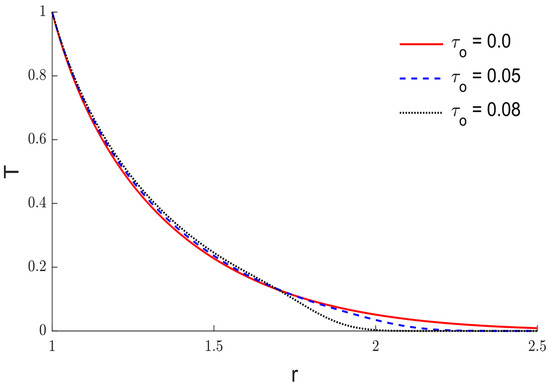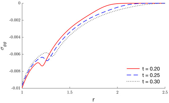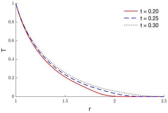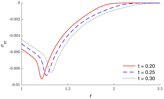 Figure 2, Figure 3, Figure 4, Figure 5, Figure 6, Figure 7, Figure 8, Figure 9, Figure 10, Figure 11, Figure 12, Figure 13, Figure 14, Figure 15, Figure 16, Figure 17, Figure 18, Figure 19, Figure 20 and Figure 21 show the calculated physical values (numerical) under generalized thermoelastic theory with one thermal delay time based on the previous set of parameters. The computation is carried out for the time . The temperature variations, radial displacement, and the variation in the radial and shear stress distributions along the radial distances under variable thermal conductivity are determined numerically. Figure 2 shows the variation in temperature along the radial distance . It is clear that the temperature has maximums value at the internal surface of hole to accept the boundary condition of the problem, and then steadily falls when the radial distance is increased to close to zero. Figure 3 shows the variations in radial displacement via the radial distances. It is seen that the radial displacement starts at zero, which meets the boundary condition of the problem, and lowers steadily up to peak values before decreasing to near zero. Figure 4 depicts the variations of radial stress versus the radial distances . The radial stress has maximum negative values before gradually diminishing to near zero. The variations in shear stress along the radial distance are displayed in Figure 5. It is noted that it has negative maximums before steadily rising to zero. Under the variable thermal conductivity, there are big significant variances in the values of all considering variables, according to the results. The varying thermal conductivity has a remarkable impact on the values of all considering variables, as predicted. Figure 6, Figure 7, Figure 8 and Figure 9 show the impact of thermal delay time in all physical quantities, whereas Figure 10, Figure 11, Figure 12 and Figure 13 show the variation of physical quintettes along the distance for different time values. The variations in temperature, the radial displacement, the radial stress and the shear stress under comparisons between the isotropic and orthotropic materials under varying thermal conductivity and with one relaxation time are shown in Figure 14, Figure 15, Figure 16 and Figure 17. The analytical results for isotropic elastic material have been presented to verify that the suggested approach is accurate as in Figure 14, Figure 15, Figure 16 and Figure 17. Additionally, the variations of temperature, the radial displacement, the radial stress and the shear stress under the comparisons between the elastic and orthotropic materials under varying thermal conductivity and with one relaxation time are shown in Figure 18, Figure 19, Figure 20 and Figure 21. Finally, based on the numerical results, it is possible to infer that utilizing a generalized thermoelastic theory under the changing thermal conductivity is a major phenomenon with a considerable effect on the physical quantity distributions.