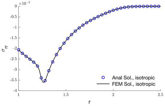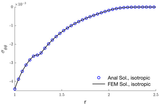 Analytical solutions for homogeneous and isotropic material are being provided to validate the finite element approach. Moreover, when , the analytical and numerical solutions are compared with each other to validate the numerical solutions. For homogeneous and isotropic material and . As a consequence of this, Equations (14)–(16) with the initial and boundary conditions may be expressed as follows: