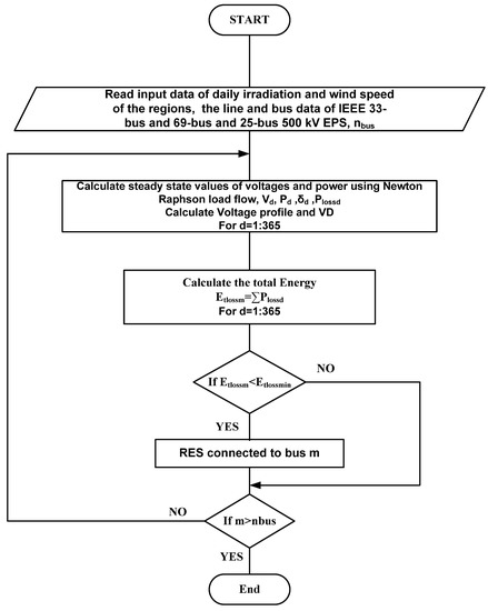 The proposed algorithm is divided into three sections: calculation of the 25-bus 500 kV EPS performance without and with Egyptian RES projects (in operation and under construction), selection of the optimal locations of RESs to connect to the IEEE 33-bus and 69-bus distribution systems, and the realistic 25-bus 500 kV EPS that provide the minimum annual total power and improve the voltage profile considering the maximum load capacity of 25-bus 500 kV EPS.