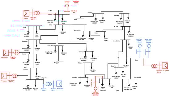 - Abdalla, O.H.; Abdel Ghany, A.M.; Fayek, H.H. Development of a Digital Model of the Egyptian Power Grid for Steady-State and Transient Studies. In Proceedings of the 11th International Conference on Electrical Engineering ICEENG 2018, Cairo, Egypt, 3–5 April 2018; pp. 1–15. [Google Scholar]