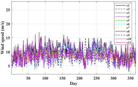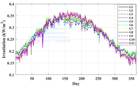 - Start calculating the active and reactive power of RES depending on the weather condition, solar irradiation for the PV system, and wind speed for the wind farm.where and are irradiation intensity and wind speed at bus 1. Their values were obtained from the NASA website for the period 1 January 2021 to 31 December 2021.