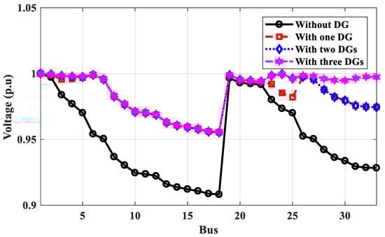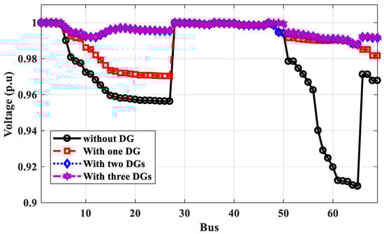 Voltage profile of IEEE 69-bus without and with DGs for power loss calculation.