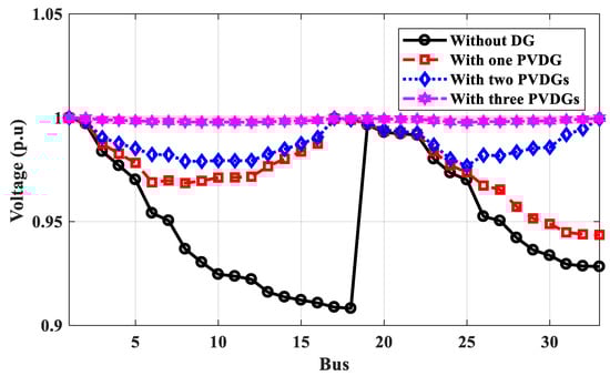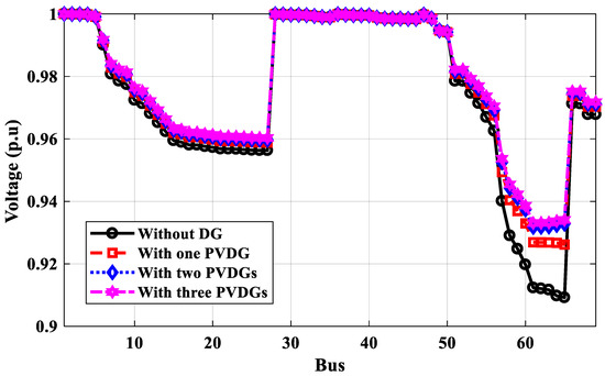 Voltage profile of IEEE 69-bus without and with PV system DGs for annual energy loss calculation.