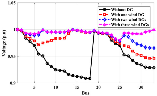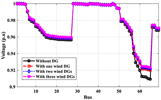 According to Table 4, the optimal locations of one, two, or three DGs for the proposed technique based on power calculation are 61, 61, 17, and 61, 17, 49, respectively, compared to 62, 62, 17, and 61, 17, 9 for the PSO method and 61, 61, 17, and 61, 18, 49 for the GA method based on power calculation. The power loss of the IEEE 69-bus distribution system calculated by the proposed method is less than those values using PSO and GA. As shown in Figure 16, the voltage profile has been improved with more DGs, and the minimum voltage at bus No. 65 is optimized to 0.9879 p.u. The optimal locations of DGs under IEEE 69-bus based on energy calculations are different than the locations based on power calculations and depend on the type of DG PV system or wind system. The optimal locations of PV system DGs are 64, 65, and 56, compared to 64, 57, and 9 for wind system DGs using the proposed method. Table 4 shows that the effective value of the output power of DGs is different than their rates, which depend on the weather conditions. The effective output power of DGs is less than their rates. The proposed technique used these effective values to get the optimal locations considering the weather conditions. The optimal locations of DGs of PV systems or wind systems based on energy calculations are made to improve the voltage profile lower than the voltage profile of their optimal locations based on power calculations because the effective output power is small, as shown in Figure 17 and Figure 18, respectively. The voltage at bus No. 65 has been improved to 0.9231 p.u and the minimum voltage is 0.933 at bus No. 61 for PV system DGs.