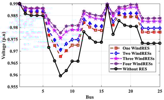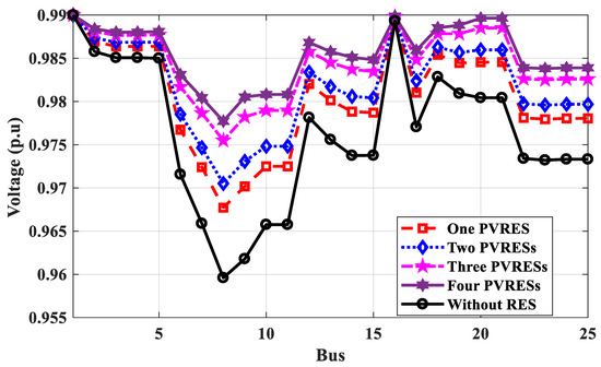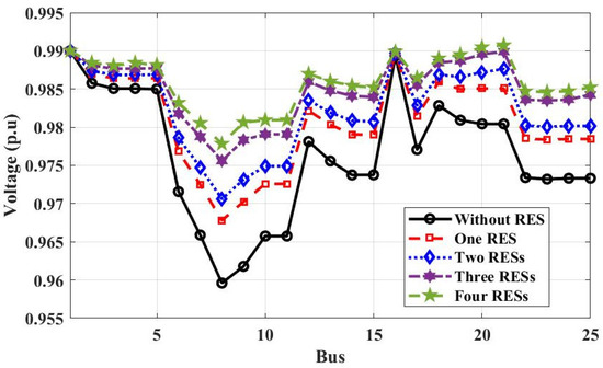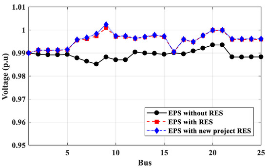 Voltage profile of 25-bus 500 kV EPS without and with RESs for power loss calculation.