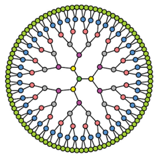 A k-Cayley tree with levels l is a tree where all vertices have the same degree k except the leaves. Figure 4 depicts the Cayley tree’s structure, which has a degree of 3 and a level of 6.