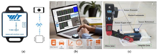 (a,b) The hardware of the motion capture system. Source: https://www.wit-motion.com/. (c) Three-dimensional rigid body structure.