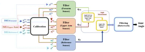 In this study, we proposed a two-stage orientation measurement algorithm that can estimate the joint angles of the elbow joint using the accelerometer, gyroscope, and magnetometer raw data from three IMUs. Among them, two IMUs were attached above and below the elbow joint of the rigid body, and the third IMU acted as a reference, placed in the shoulder position (static). At the beginning of the proposed algorithm, each IMU sensor’s data were calibrated, and in the first stage, all sensor data were fused using the Madgwick filter, which returns output in quaternion form. In the second stage, the joint angle was estimated by fusing the quaternion data of all IMUs obtained in the first stage. Finally, to eliminate the high frequency components from the estimated angle, the joint angle was passed through a fourth-order Butterworth low-pass filter. Algorithm 1 outlines the procedure that has been proposed for estimating the joint angle. The proposed algorithm is represented as a block diagram in Figure 2.