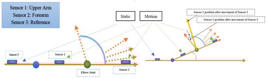 The performance of the proposed joint monitoring algorithm was first tested to obtain the elbow joint angle of the rigid body using two sensors, one in the forearm and another in the upper arm, shown in Figure 3.