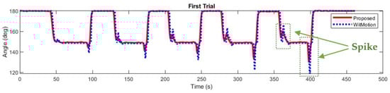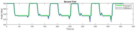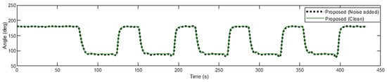 In Figure 11, the joint angle is shown, estimated using the proposed algorithm that takes into account the noisy accelerometer data, and compared to the angle obtained using the proposed algorithm with clean accelerometer data. Table 9 displays the root mean square error associated with calculated joint angles when an external acceleration is present. Figure 11 and Table 9 both demonstrate that the suggested algorithm was exceptionally resistant to the effects of acceleration from the environment, as the RMSE was 0.996° after the addition of external noise. Moreover, the RMSE value was below the threshold of 5°, which is considered clinically acceptable [].