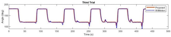 The performance of the proposed algorithm (PA), using two sensors, was evaluated with respect to the angle measurement value of the EGs and the angle measured from the KF outcomes of WitMotion software (WM) in terms of root mean square error (RMSE), which are presented in Table 3. Figure 4 shows joint angle graphical representations obtained from the proposed algorithm with two sensors and WitMotion outcomes for five different trials. In this case, the RMSEs for PA and WM were 0.26° and 0.43°, respectively. It can be seen that the proposed joint angle measurement system using two sensors and the Madgwick filter gives a more accurate estimation in this case.