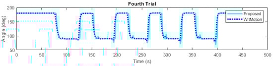 Measured angle using proposed algorithm (PA) and WitMotion (WM) (fourth trial).