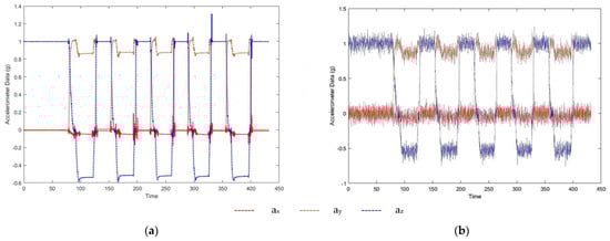 In the presence of an external acceleration, the proposed algorithm’s effectiveness was verified by simulating zero-mean white Gaussian noise to the acceleration measurements of all three IMUs. Zero-mean Gaussian noise was used to create external acceleration as IMU noise is best fitted by a Gaussian distribution, and the noise in IMU is white Gaussian in nature [,]. Figure 10a shows the sample raw accelerometer data without external noise, and Figure 10b displays the sample raw accelerometer data with external noise, which was contaminated at 20 dB signal-to-noise ratio (SNR) for one wearable IMU.