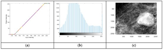 Figure 2 demonstrates the output intensity, the corresponding histogram of the mammogram image in Figure 1a and the output image after applying the piecewise linear function.