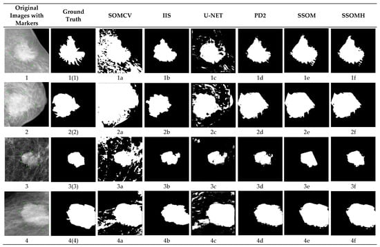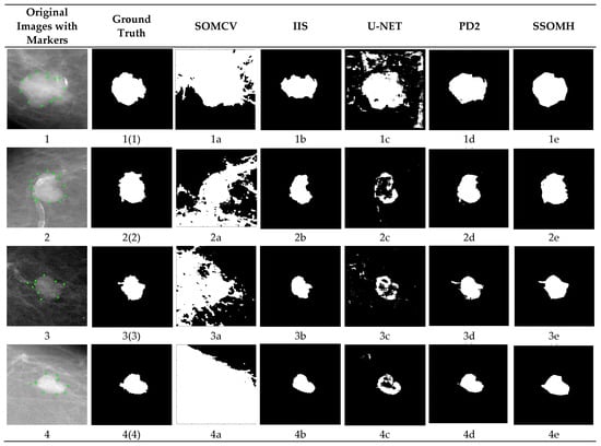 In this second experiment, 50 mammography images of size 256 × 256 pixels from the CBIS-DDSM database were tested. The SSOMH is compared with SOMCV, IIS, U-Net and PD2 models. Figure 5 demonstrates 4 samples of input images (out of 50 test images) with green markers indicating the targeted object and the ground truth images as benchmarks for the segmentation. The results were presented in the form of binary images.