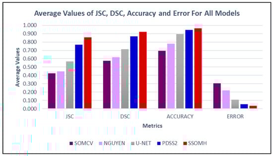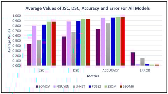 From Table 3 and Figure 6, the SSOMH model achieved the highest values of the JSC, DSC and Accuracy metrics and the lowest value of Error, which indicate the highest segmentation accuracy in segmenting the targeted objects compared to the SOMCV, IIS, U-NET and PD2 models. The lowest values of JSC, DSC and Accuracy are obtained with the SOMCV model.