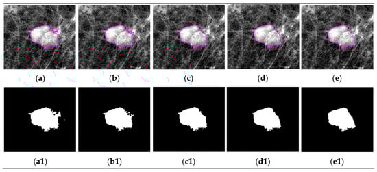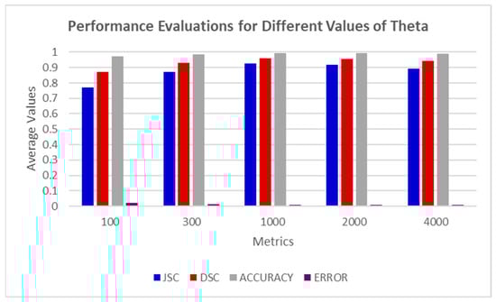 We set the values of parameter θ for (a–e) to 100, 300, 1000, 2000 and 4000, respectively. The respective results are indicated in (a1–e1). By visual observation, (c1) with θ = 1000 shows a better segmentation result compared with (a1,b1,d1,e1) according to the benchmark in Figure 3. In addition, the quantitative evaluation of the segmentation accuracy is also provided based on the JSC, DSC, Accuracy and Error metrics. Figure 8 illustrates the values of JSC, DSC, Accuracy and Error for different values of θ.