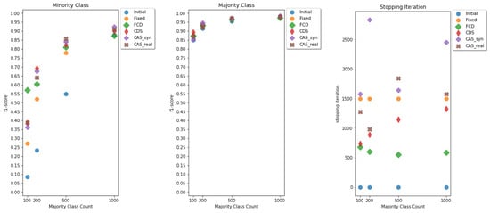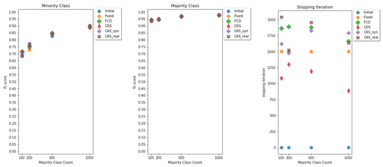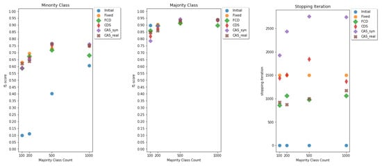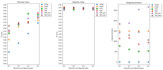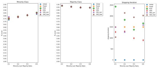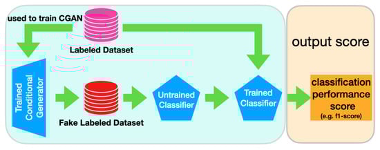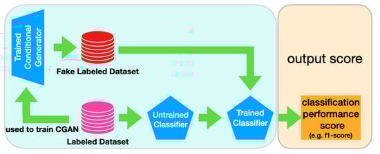 This oracle begins by using the available labelled data to train a CGAN. Then, the CGAN is asked to generate a labelled dataset, which is fed to a classifier. The classifier is trained using the generated data. Finally, the trained classifier’s performance is evaluated on the real labelled dataset. Any selected performance assessment metric can be used to evaluate the performance of the classifier. In our implementation, we selected the F1 score to be used because we decided to test this oracle instance in an imbalanced problem, and the F1 score is a suitable metric in this context. In this particular case, the higher the CAS-real score, the higher the quality of the GAN outputs. Figure 1 displays the key structure of the described oracle instance based on CAS-real.