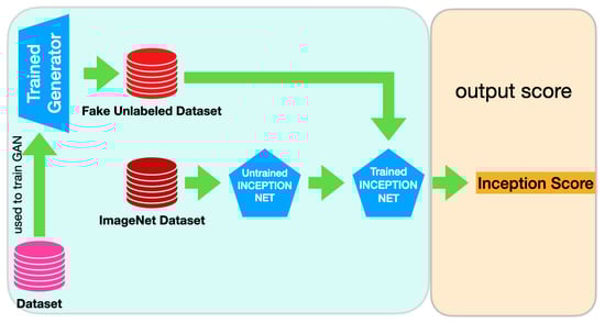 A different approach named the Inception Score (IS) is proposed by Salimans et al. [31]. To begin, the conditional label distribution is computed by applying an InceptionNet model to each image produced by a GAN trained on the original dataset. The assumptions underlying this approach are that: (i) the GAN should generate images with high confidence for each label, i.e., has a low entropy; and (ii) the GAN should produce varied images, i.e., the marginal has a high entropy. Based on these two requirements, the authors propose the use of the following metric , which they claim has a direct correlation with human judgment. The expected value of KL-divergence is exponentiated to allow for an easier comparison.