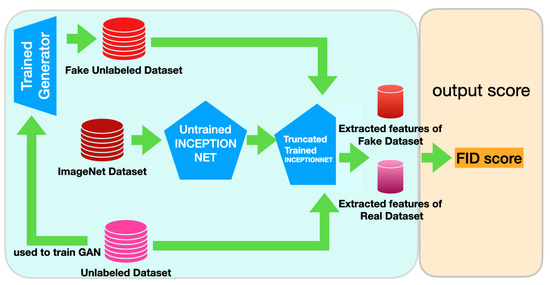 Heusel et al. [32] proposes to use the features extracted from both real (r) and generated data (g) to assess the quality of images created by a GAN. Typically, an InceptionNet model is trained on the ImageNet dataset, and the results of the last pooling layer prior to the output classification layer are used as the extracted features.