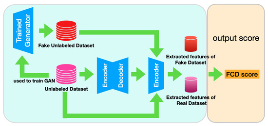 This oracle instance is based on FCD and begins by training a GAN and an auto-encoder using the available real dataset. Then, the GAN generator is used to generate new fake data. The real and generated data are given to the encoder so that we can obtain a new representation of their features. Finally, the extracted features of both real and generated data are used to calculate the FCD score. The lower the FCD score is, the higher the quality of the GAN outputs. Similar to the modified FID introduced in [41], we implemented an oracle using the FCD, as shown in Figure 5. We also included a minor implementation detail by multiplying the FCD score by minus one; this allowed us to observe a positive correlation between the FCD score and the quality of the outputs. This oracle instance can be used with both conditional and non-conditional GANs.